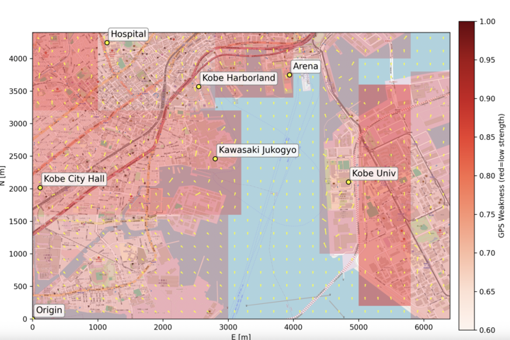 この図の赤い部分はGPS信号が弱くなるエリア。港湾の構造物や高層ビルの陰影が、そのまま電波の“地形”として浮かび上がっています。さらに、黄色の矢印は風の流れを表しています。