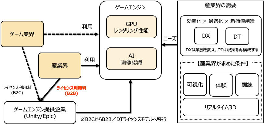 Unity や Unreal Engine はここに明確に舵を切り、B2Bでのライセンス利用料を拡大し、デジタルツイン領域に本格参入したわけです。