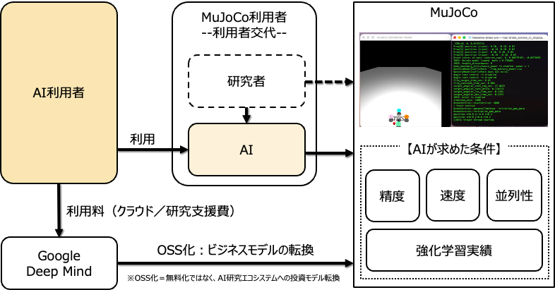 Google / DeepMind が MuJoCo を OSS にした背景には、この 利用者の中心が「人」から「AI」へ移った という変化に見えました。