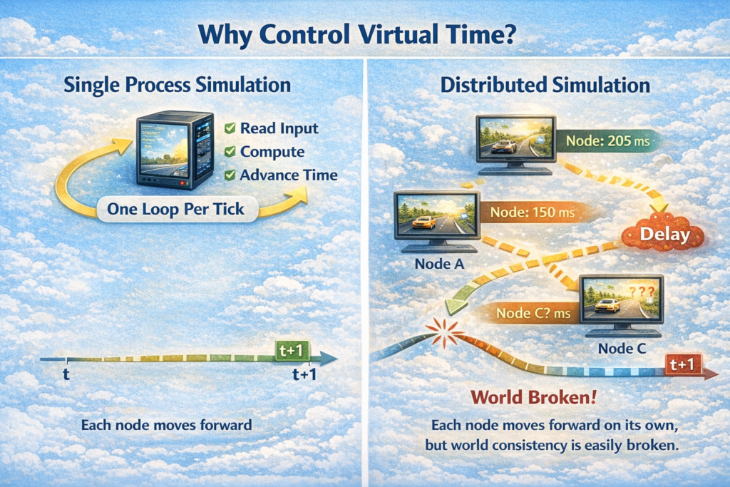 ここで、シミュレーション時間について、単一プロセスのシミュレーションでやる場合、仮想時間の扱いはそれほど問題になりません。